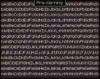 You will most likely need to do some manual cleanup, but this should get you mostly done with kerning. In the project files, I've included a Python 3.11.0 script which takes in all symbols in the font as input, and outputs every combination of those symbols. You can copy and paste the output into Pixel Font Converter's preview, and look over it to see if any symbols need to be fixed.